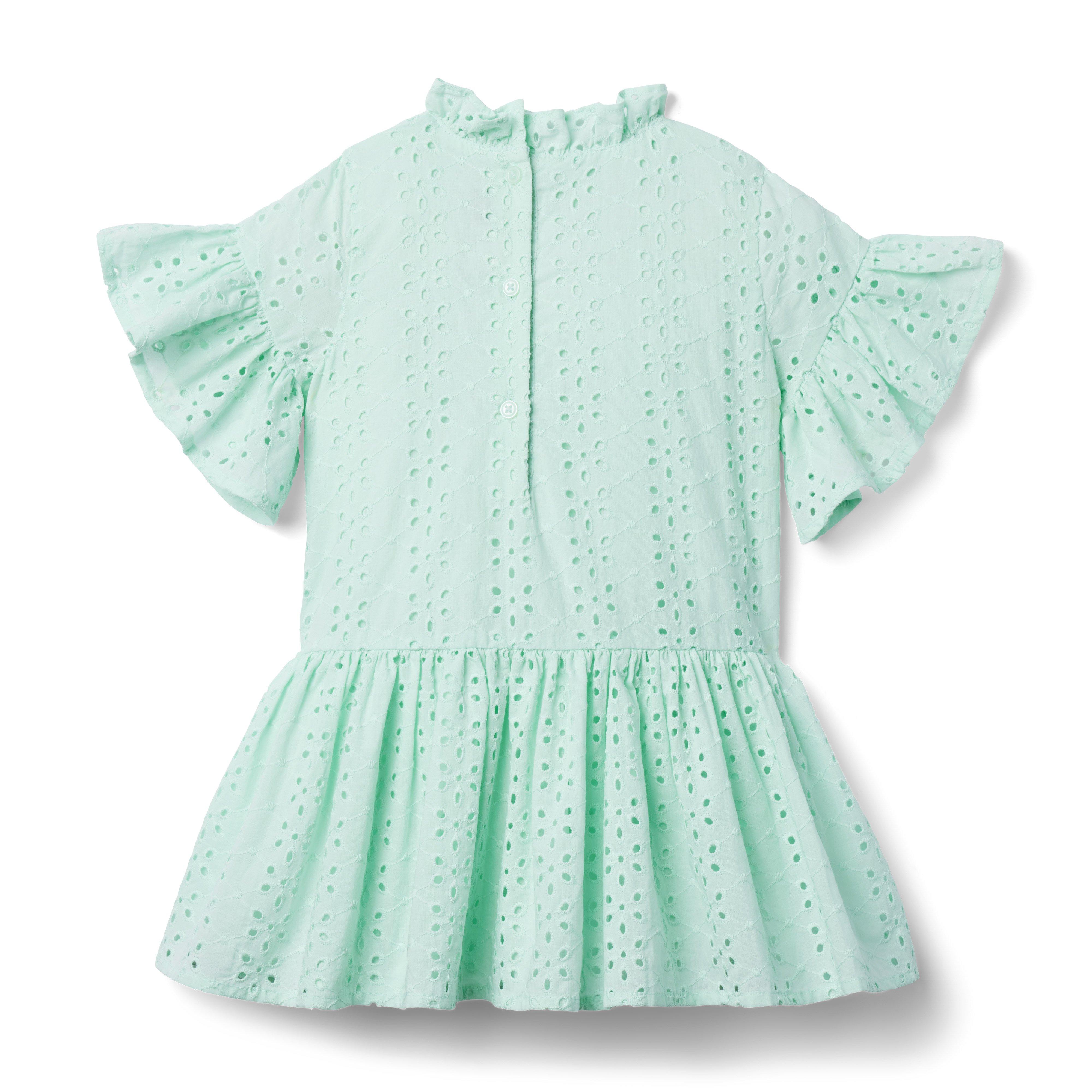 - A swingy silhouette we love, with flutter sleeves and a ruffled neck, in allover eyelet perfect for special celebrations.