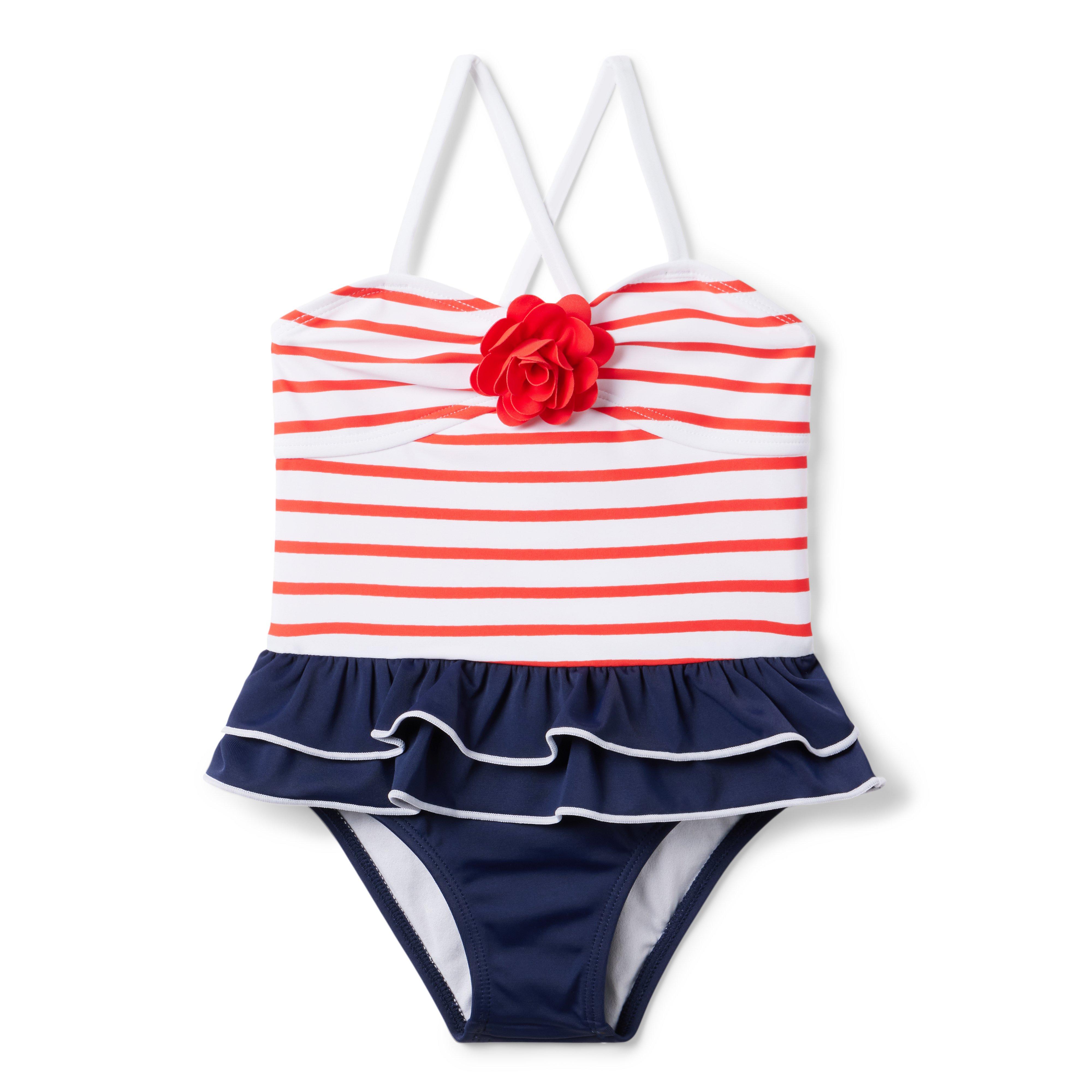 - A retro swimsuit with Americana charm. Featuring red and white stripes with a 3D rosette, plus double ruffles with contrast stitching. Perfect for pool parties and summer days. Responsibly made with recycled polyester fabric.